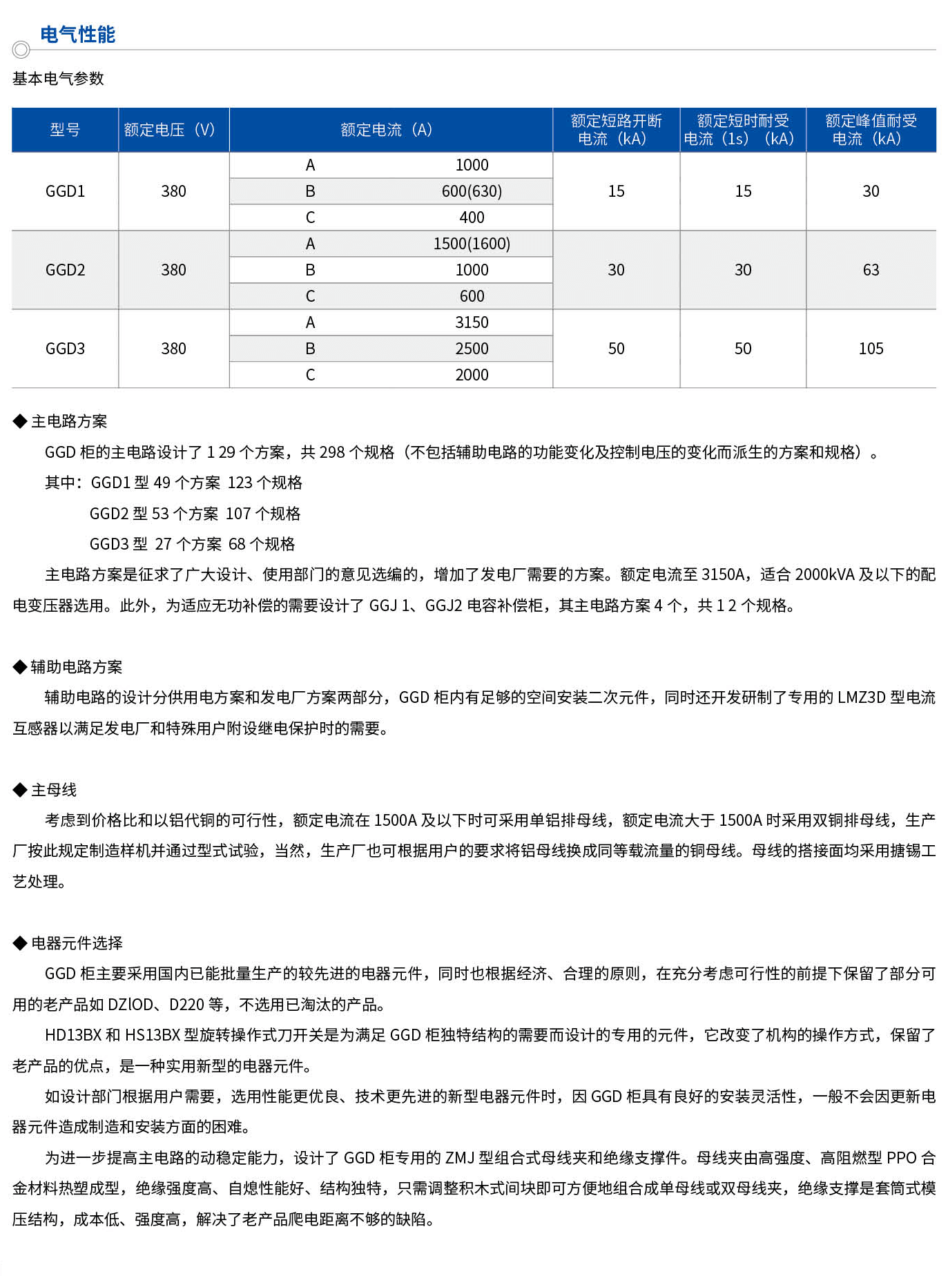 GGD交流低壓固定式開關(guān)柜適用于發(fā)電廠、變電站、廠礦企業(yè)等電力用戶的交流50HZ,額定工作電壓380V,額定工作電流至3150A的配電系統(tǒng),作為動力、照明及配電設(shè)備的電能轉(zhuǎn)換、分配與控制之用。GGD交流低壓固定式開關(guān)柜是根據(jù)能源部主管上級與廣大電力用戶及設(shè)計部門的要求,本著安全、經(jīng)濟(jì)、合理、可靠的原則設(shè)計的新型低壓配電柜。產(chǎn)品具有分?jǐn)嗄芰Ω摺訜岱€(wěn)定性好、電氣方案靈活、組合方便、系列性、實(shí)用性強(qiáng)、結(jié)構(gòu)新穎、防護(hù)等級高等特點(diǎn),可作為低壓成套開關(guān)設(shè)備的更新?lián)Q代產(chǎn)品使用。GGD交流低壓固定式開關(guān)柜符合EC439《低壓成套開關(guān)設(shè)備和控制設(shè)備》,GB7251《低壓成套開關(guān)設(shè)備》等標(biāo)準(zhǔn)。