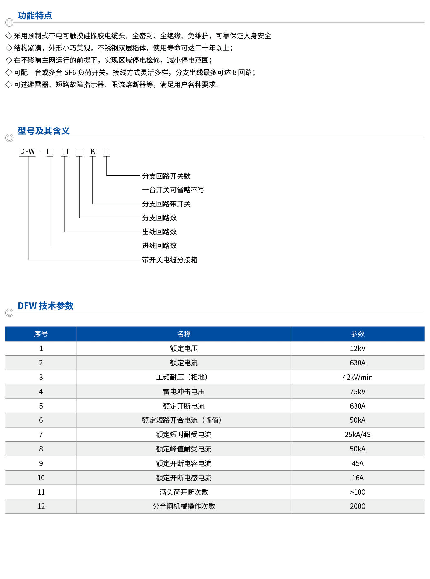 功能特點:采用預制式帶電可觸摸硅橡膠電纜頭,全密封、全絕緣、免維護,可靠保證人身安全。結構緊湊,外形小巧美觀,不銹鋼雙層稻體,使用壽命可達二十年以上;在不影響主網運行的前提下,實現區域停電檢修,減小停電范圍;可配一臺或多臺SF6負荷開關。接線方式靈活多樣,分支出線可達8回路;可選避雷器、短路故障指示器、限流熔斷器等,滿足用戶各種要求。